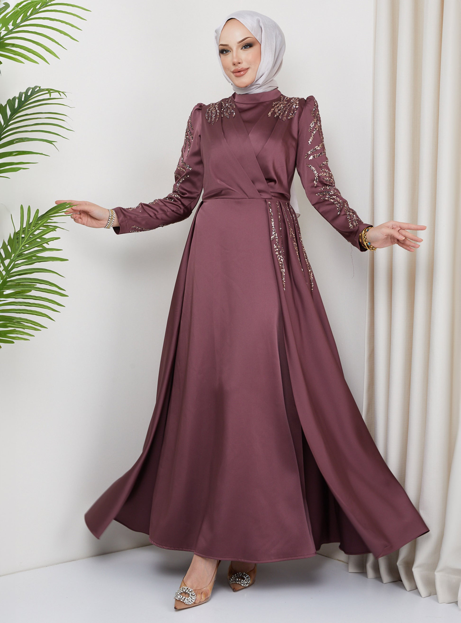 Embrace sophistication with this satin evening dress, adorned with sequin and stone detailing on the front and sleeves. The Dusty Rose hue adds a touch of elegance. This dress is perfect for special occasions, blending style with modesty. Measurements: Waist 72 cm, Hips 94 cm, Front Length 145 cm.